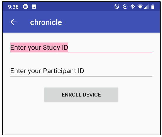 STEP 7: Back in the Chronicle app you will see this screen asking for your Study ID and Participant ID. Now, go to your email on your phone and click on the link we provided to you.