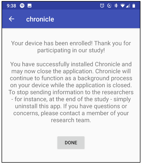REMEMBER: DO NOT CLOSE THE CHRONICLE APP during all of the days of data collection. Keep the Chronicle app running in the background of your device!