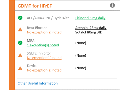 Retrospective chart review suggested that integration of the pharmacist in the heart failure clinic did increase adherence to GDMT within the heart failure clinic, and that GDMT prescriptions were higher in the heart failure clinic than general cardiology which did not have the pharmacist intervention. However, the data collection process revealed that intolerances and contraindications to GDMT were not documented consistently, if at all, in discrete fields. Observations in the clinic revealed that there were multiple steps and various workflows being used to retrieve the information needed for GDMT decision making at point of care. These findings informed the design of a “GDMT Snapshot” concept in the EHR that would support GDMT prescription, depicted in the image on this page. It included features such as tracking medication titration and providing supporting information in the EHR to facilitate decision making related to GDMT.